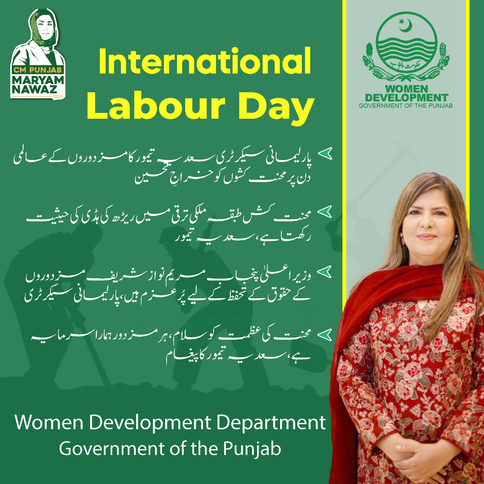 Parliamentary Secretary Saadia Taimoor Pays Tribute to Workers on International Labour Day and Reaffirms Commitment to Their Rights